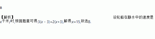 B 【解析】设轮船在静水中的速度是x千米/时,根据题意可得:3(x-3)=2(x+3),解得:x=15,故选B.