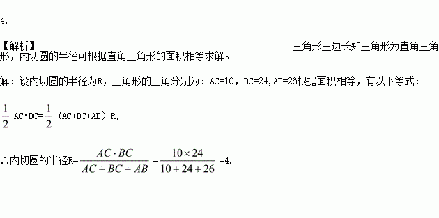 若一三角形的三边长分别为10、24、26,则此三角形的内切圆半径为__________.