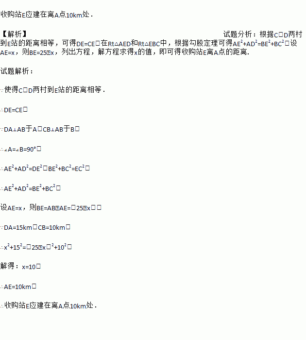 如图,笔直的公路上A、B两点相距25km,C、D为两村庄,DA⊥AB于点A,CB⊥AB于点B,已知DA=15km,CB=10km,现在要在公路的AB段上建一个土特产品收购站E,使得C、D两村到收购站E的距离相等,则收购站E应建在离A点多远处?