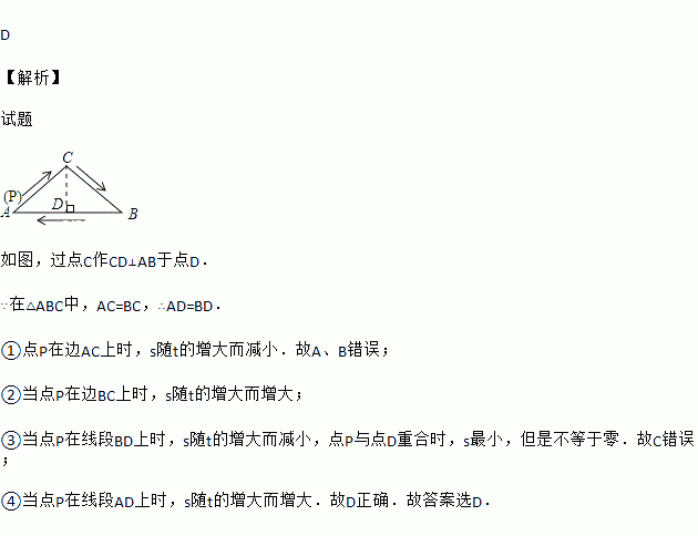 如图,在△ABC中,AC=BC,有一动点P从点A出发,沿A→C→B→A匀速运动.则CP的长度s与时间t之间的函数关系用图象描述大致是( )