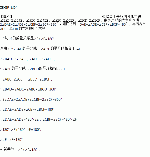 如图,在四边形ABCD中,∠BAD的平分线与∠ADC的平分线相交于点E,∠ABC的平分线与∠BCD的平分线相交于点F,则∠E与∠F的数量关系是__________.