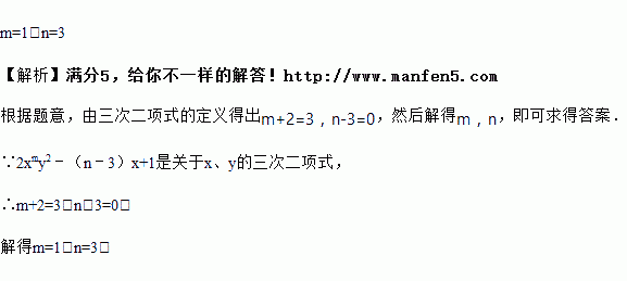 若2xmy2﹣(n﹣3)x+1是关于x、y的三次二项式,求m、n的值.