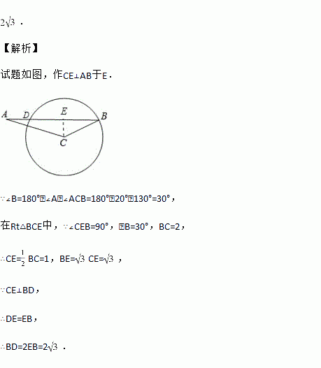 如图,在△ABC中,已知∠ACB=130°,∠BAC=20°,BC=2,以点C为圆心,CB为半径的圆交AB于点D,则BD的长为 .