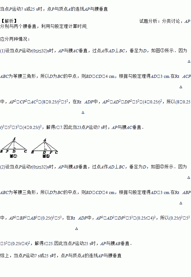 如图17-Z-12所示,等腰三角形ABC的底边长为8 cm,腰长为5 cm,一动点P在底边上从点B向点C以0.25 cm/s的速度移动,请你探究:当点P运动几秒时,点P与顶点A的连线AP与腰垂直?