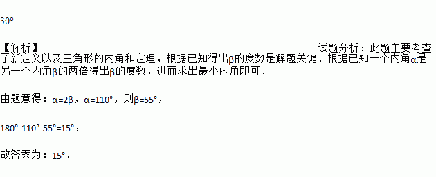 30° 【解析】试题分析:此题主要考查了新定义以及三角形的内角和定理,根据已知得出β的度数是解题关键.根据已知一个内角α是另一个内角β的两倍得出β的度数,进而求出最小内角即可. 由题意得:α=2β,α=110°,则β=55°, 180°-110°-55°=15°, 故答案为:15°.