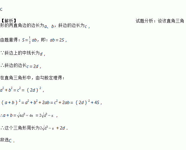 直角三角形的面积为S,斜边上的中线长为d,则这个三角形周长为( )