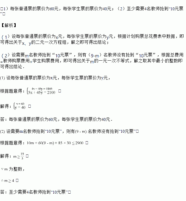 Èô×îÖÕÕâ9Ãû½Ìʦ¡¢85ÃûѧÉú¹ºÂòÃÅÆ±µÄ×Ü»¨·Ñ²»Äܳ¬¹ý2900Ôª£¬ÔòÖÁÉÙÐèÒª¼¸Ãû½ÌʦÇÀµ½¡°10ԪƱ¡±£¿![]()
