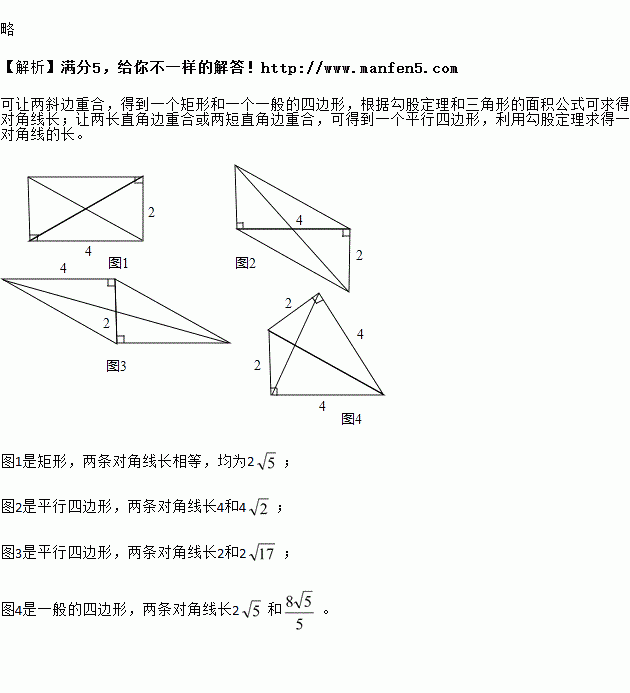 如图,已知在△ABC中,AB=AC,AD⊥BC于D,且AD=BC=4,若将三角形沿AD剪开成为两个三角形,在平面上把这两个三角形拼成一个四边形,你能拼出所有的不同形状的四边形吗?画出所拼四边形的示意图(标出图中的直角),并分别写出所拼四边形的对角线的长.(只需写出结果即可)![]()