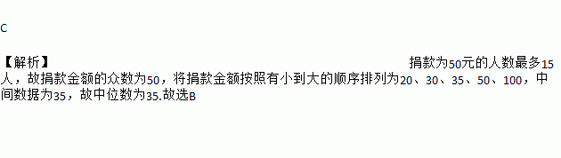 C 【解析】捐款为50元的人数最多15人,故捐款金额的众数为50,将捐款金额按照有小到大的顺序排列为20、30、35、50、100,中间数据为35,故中位数为35.故选B