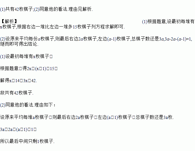 (2)小明认为:无论最初的棋子数为多少,按上述方法完成操作后,中间一堆总是剩下1枚棋子,你同意他的看法吗?请说明理由.