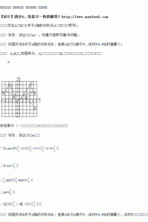(1)若△A1B1C1与△ABC关于y轴成轴对称,则△A1B1C1三个顶点坐标分别为A1_____,B1_____,C1_____