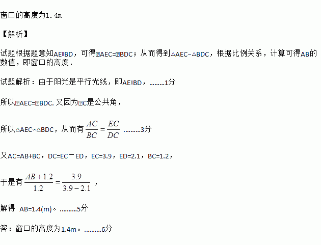 如图,阳光通过窗口照到教室内,竖直窗框在地面上留下2.1m长的影子如图所示,已知窗框的影子DE到窗下墙脚的距离CE=3.9m,窗口底边离地面的距离BC=1.2m,试求窗口的高度.(即AB的值)
