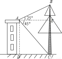 如图,小明在楼上点A处测量大树的高,在A处测得大树顶部B的仰角为25°,测得大树底部C的俯角为45°.已知点A距地面的高度AD为12m,求大树的高度BC.(最后结果精确到0.1)
