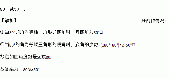 一个等腰三角形的一个内角是,则等腰三角形的底角为___________
