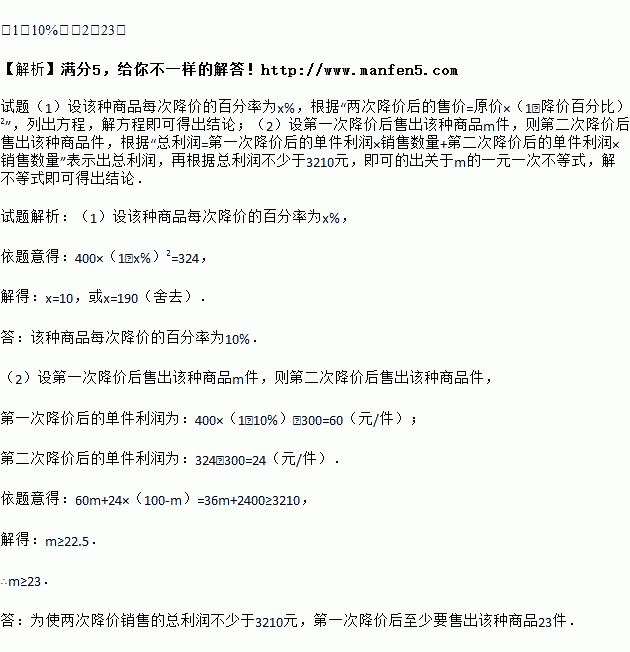 (2)若该种商品进价为300元/件,两次降价共售出此种商品100件,为使两次降价销售的总利润不少于3210元.问第一次降价后至少要售出该种商品多少件?