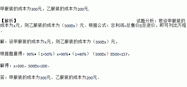 甲服装的成本为300元,乙服装的成本为200元. 【解析】试题分析:若设甲服装的成本为x元,则乙服装的成本为(500﹣x)元.根据公式:总利润=总售价﹣总进价,即可列出方程. 【解析】 设甲服装的成本为x元,则乙服装的成本为(500﹣x)元, 根据题意得:90%•(1+50%)x+90%•(1+40%)(500﹣x)﹣500=157, 解得:x=300,500﹣x=200...