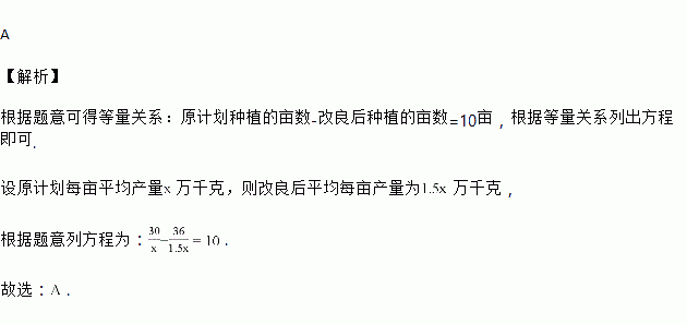 衡阳市某生态示范园计划种植一批梨树,原计划总产值30万千克,为了满足市场需求,现决定改良梨树品种,改良后平均每亩产量是原来的1.5倍,总产量比原计划增加了6万千克,种植亩数减少了10亩,则原来平均每亩产量是多少万千克?设原来平均每亩产量为x万千克,根据题意,列方程为( )