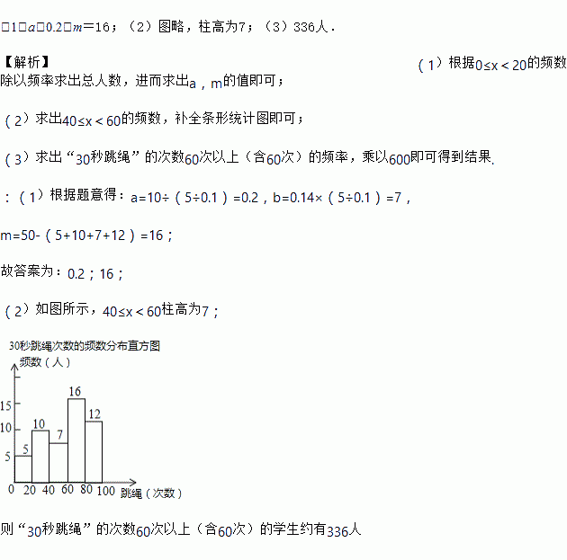 (3)若该校九年级共有600名学生,请你估计“30秒跳绳”的次数60次以上(含60次)的学生有多人?