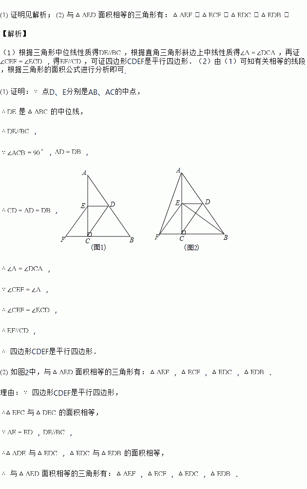 ,点D、E分别是AB、AC的中点,点F在BC延长线上,连接EF,且.![]()