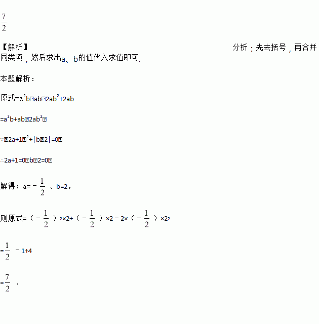 先化简,再求值:(a2b﹣ab)﹣2(ab2﹣ba),其中(2a+1)2+|b﹣2|=0.