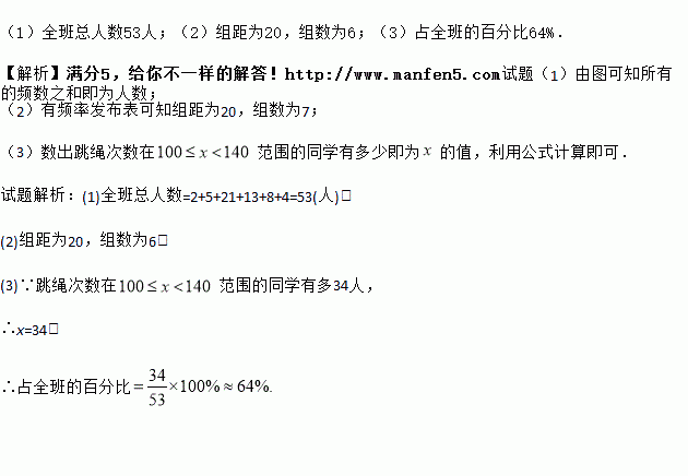 (3)跳绳次数在100≤x<140范围内同学有多少人,占全班的百分之几(精确到0.01%)?