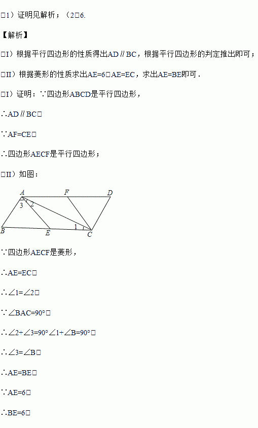 (Ⅱ)如图②,若∠BAC=90°,且四边形AECF是边长为6的菱形,求BE的长.