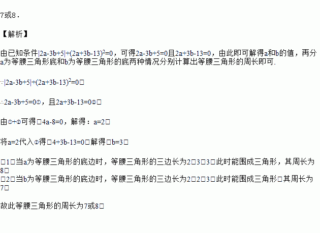 已知等腰三角形的两边长分别为a,b,且a,b满足|2a-3b+5|+(2a+3b-13)2=0,求此等腰三角形的周长.