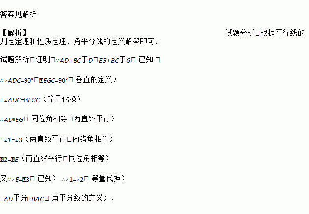 看图填空:已知如图,AD⊥BC于D,EG⊥BC于G,∠E=∠3, 求证:AD平分∠BAC.