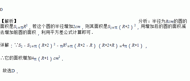 已知一个圆的半径为Rcm,若这个圆的半径增加2cm,则它的面积增加( )