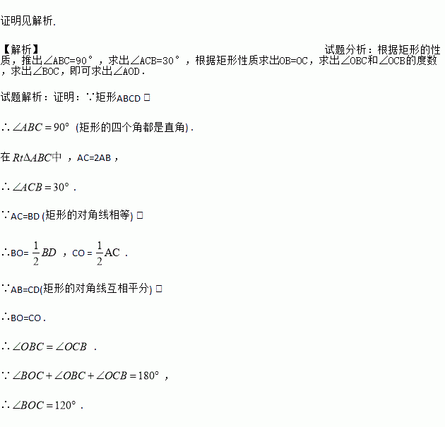 已知:如图,矩形ABCD的对角线AC和BD相交于点O, AC=2AB.求证: .