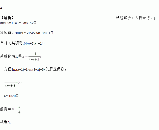 若关于x的方程3m(x+1)+5=m(3x-1)-5x的解是负数,则m的取值范围是( )