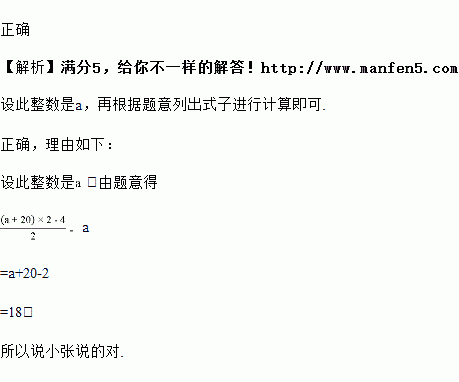 小刘、小张两位同学玩数学游戏,小刘说“任意选定一个数,然后按下列步骤进行计算:加上20,乘2,减去4,除以2,再减去你所选定的数”,小张说“不用算了,无论我选什么数,结果总是18”,小张说得对吗?说明理由.