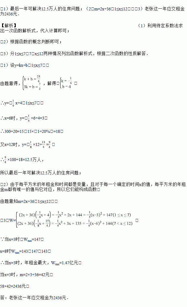 (3)在(2)的条件下,假设每年的公租房当年全部出租完,写出这12年中每年竣工投入使用的公租房的年租金W关于时间x的函数解析式,并求出W的最大值(单位:亿元).如果在W取得最大值的这一年,老张租用了58m2的房子,计算老张这一年应交付的租金.