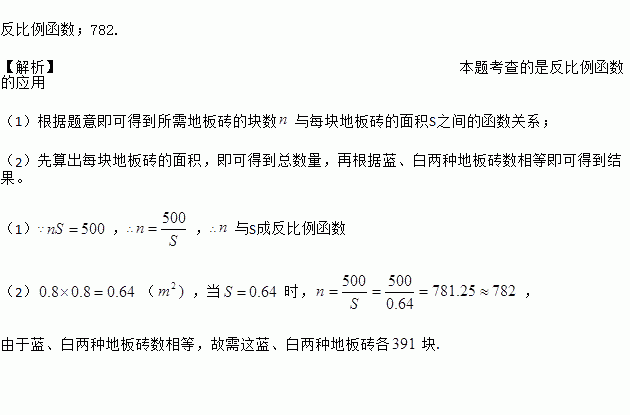 与每块地板砖的面积S有怎样的函数关系?为了使地面装饰美观,决定使用蓝、白两种颜色的地板砖组合成蓝白相间的图案,每块地板砖的规格为80×80cm2,蓝、白两种地板砖数相等,则需这两种地板砖各多少块?
