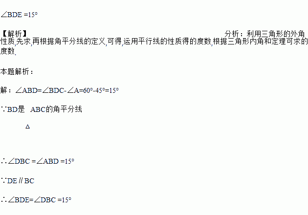 如图,BD 是△ABC 的角平分线,DE∥BC,交 AB 于点 E,∠A=45°,∠BDC=60°,求∠BDE的度数。