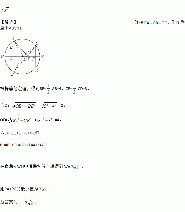 如图,AB、CD是半径为5的⊙O的两条弦,AB=8,CD=6,MN是直径,AB⊥MN于点E,CD⊥MN于点F,P为EF上的任意一点,则PA+PC的最小值为_____.