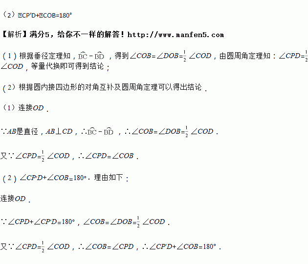 (2)点P′在劣弧CD上(不与C、D重合)时,∠CP′D与∠COB有什么数量关系?请证明你的结论.