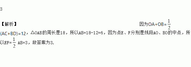 如图,□ABCD的对角线AC、BD相交于点O,点E、F分别是线段AO、BO的中点.若AC与BD的长度之和是24厘米,△OAB的周长是18厘米,则EF=________厘米.