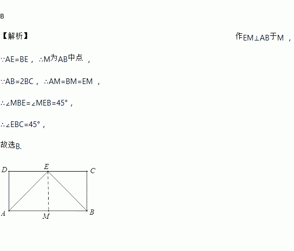 B 【解析】作EM⊥AB于M , ∵AE=BE, ∴M为AB中点 , ∵AB=2BC, ∴AM=BM=EM , ∴∠MBE=∠MEB=45°, ∴∠EBC=45°, 故选B.