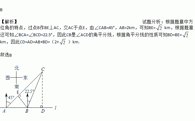 如图,在笔直的海岸线l上有A,B两个观测站,AB=2 km,从A处测得船C在北偏东45°的方向,从B处测得船C在北偏东22.5°的方向,则船C离海岸线l的距离(即CD的长)为( )