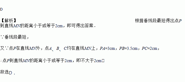 已知点 P 在直线 MN 外,点 A、B、C 均在直线 MN 上,PA=3cm,PB=3.5cm,PC=2cm, 则点 P 到直线 MN 的距离()