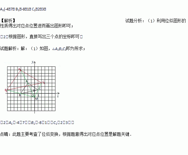 (1)以M点为位似中心,在点M的同侧作△ABC关于M点的位似图形△A1B1C1,使△A1B1C1与△ABC的位似比为2:1;