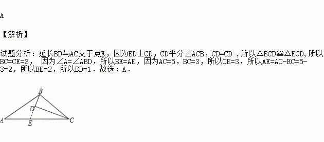 A 【解析】 试题分析:延长BD与AC交于点E,因为BD⊥CD,CD平分∠ACB,CD=CD ,所以△BCD≌△ECD,所以BC=CE=3, 因为∠A=∠ABD,所以BE=AE,因为AC=5,BC=3,所以CE=3,所以AE=AC-EC=5-3=2,所以BE=2,所以BD=1.故选:A.