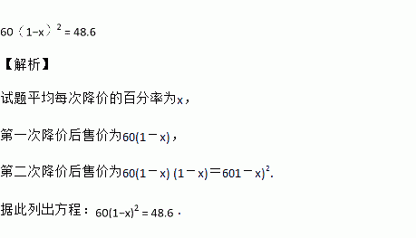 某种药品原价为60元/盒,经过连续两次降价后售价为48.6元/盒.设平均每次降价的百分率为x,则根据题意,可列方程为 .