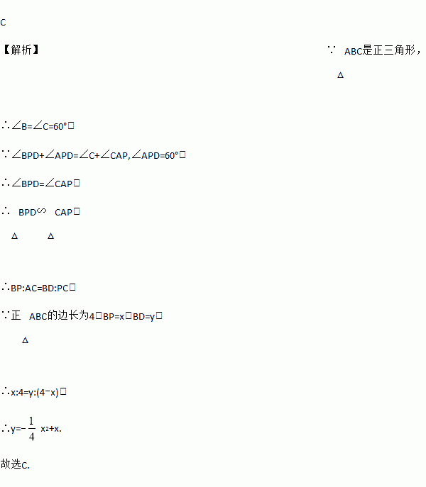 如图,正△ABC的边长为4,点P为BC边上的任意一点(不与点B、C重合),且∠APD=60°,PD交AB于点D.设BP=x,BD=y,则y关于x的函数图象大致是( )
