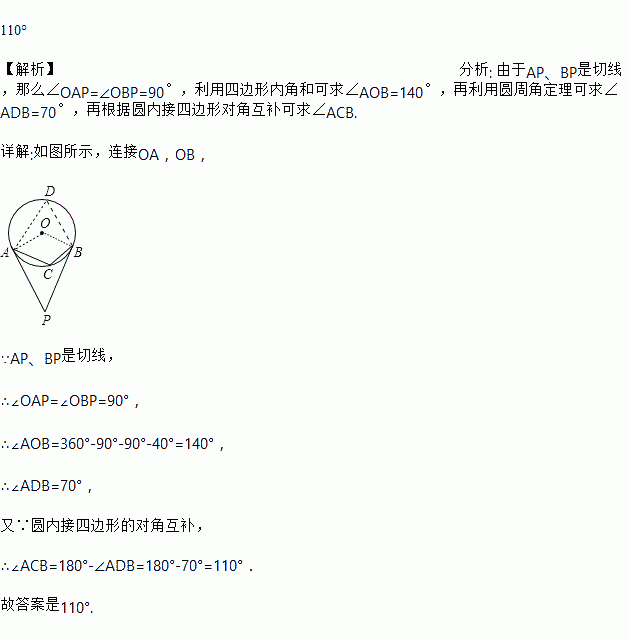 如图,PA,PB分别切⊙O于A,B两点,C是上的一点,∠P=40°,则∠ACB的度数为________.
