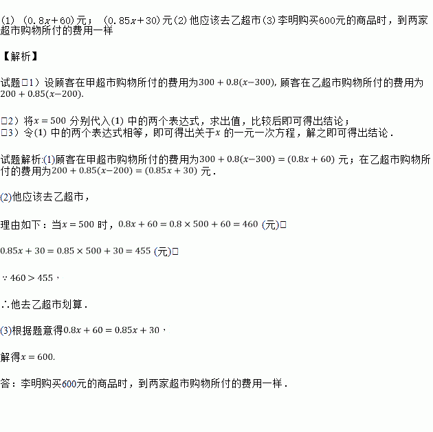 (3)计算一下,李明购买多少元的商品时,到两家超市购物所付的费用一样?