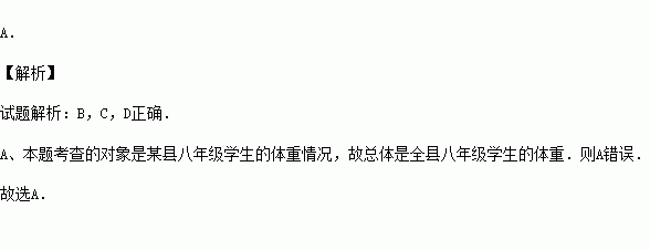 为了了解某县八年级学生的体重情况,从中抽取了200名学生进行体重测试 .在这个问题中,下列说法错误的是( )