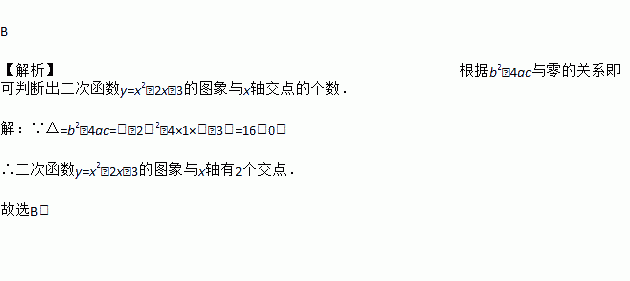 B 【解析】根据b2﹣4ac与零的关系即可判断出二次函数y=x2﹣2x﹣3的图象与x轴交点的个数. 【解析】 ∵△=b2﹣4ac=(﹣2)2﹣4×1×(﹣3)=16>0, ∴二次函数y=x2﹣2x﹣3的图象与x轴有2个交点. 故选B.