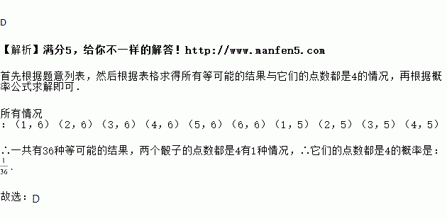 把一个骰子两次,观察向上一面的点数,它们的点数都是的概率是( )